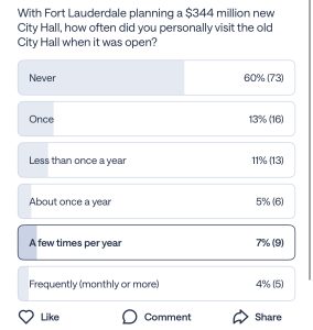 Once the project finally broke into the public conversation, the reaction was unmistakable. On December 11, 2025 the Sun Sentinel published 16 separate letters to the editor responding to the proposed City Hall, and they were overwhelmingly critical. On December 21, 2025, they published 16 more. Residents raised concerns about cost, priorities, design, and the lack of public engagement. On Nextdoor, a single post discussing the project generated nearly 200 responses, many echoing the same frustrations. This outpouring reflected what happens when people are finally made aware that a $344 million civic project is moving forward largely out of public view. I posted my own poll on Nextdoor asking residents how often they visit City Hall which received 122 votes: