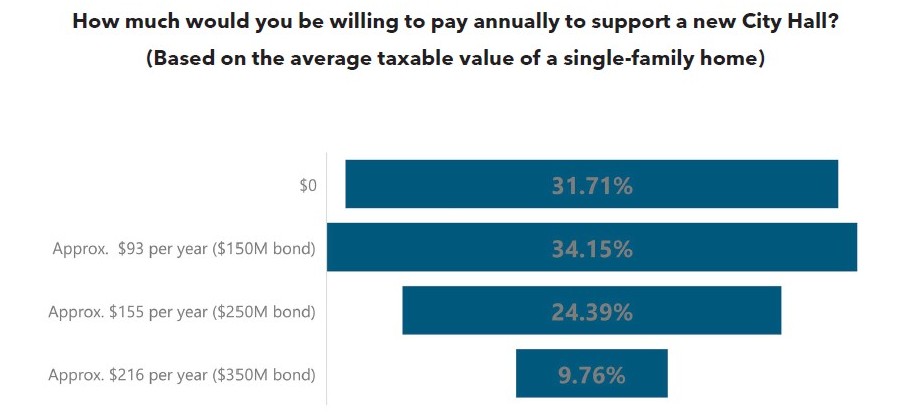 The workshops also provide a sobering glimpse into what this decision means for residents’ wallets. Only 9.76% of respondents said they would be willing to pay the roughly $216 per year for 30 years required to service a $350 million bond for City Hall. In contrast, 34.15% said they would support a $150 million bond costing about $93 per year, 24.39% said they might support a $250 million bond at approximately $155 per year, and 31.71% said they would not support a bond at all.