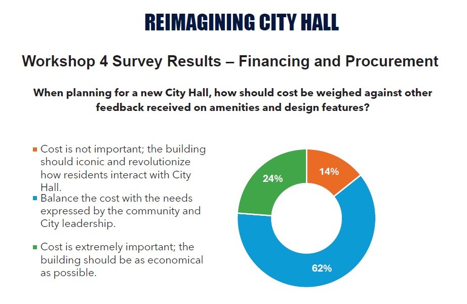 The workshop results are telling. When asked about cost priorities, only 14% of respondents said cost was not important and that the building should be iconic. A clear majority, 62%, said costs should be balanced with community needs and City leadership priorities. Another 24% said cost was extremely important and that the building should be as economical as possible.